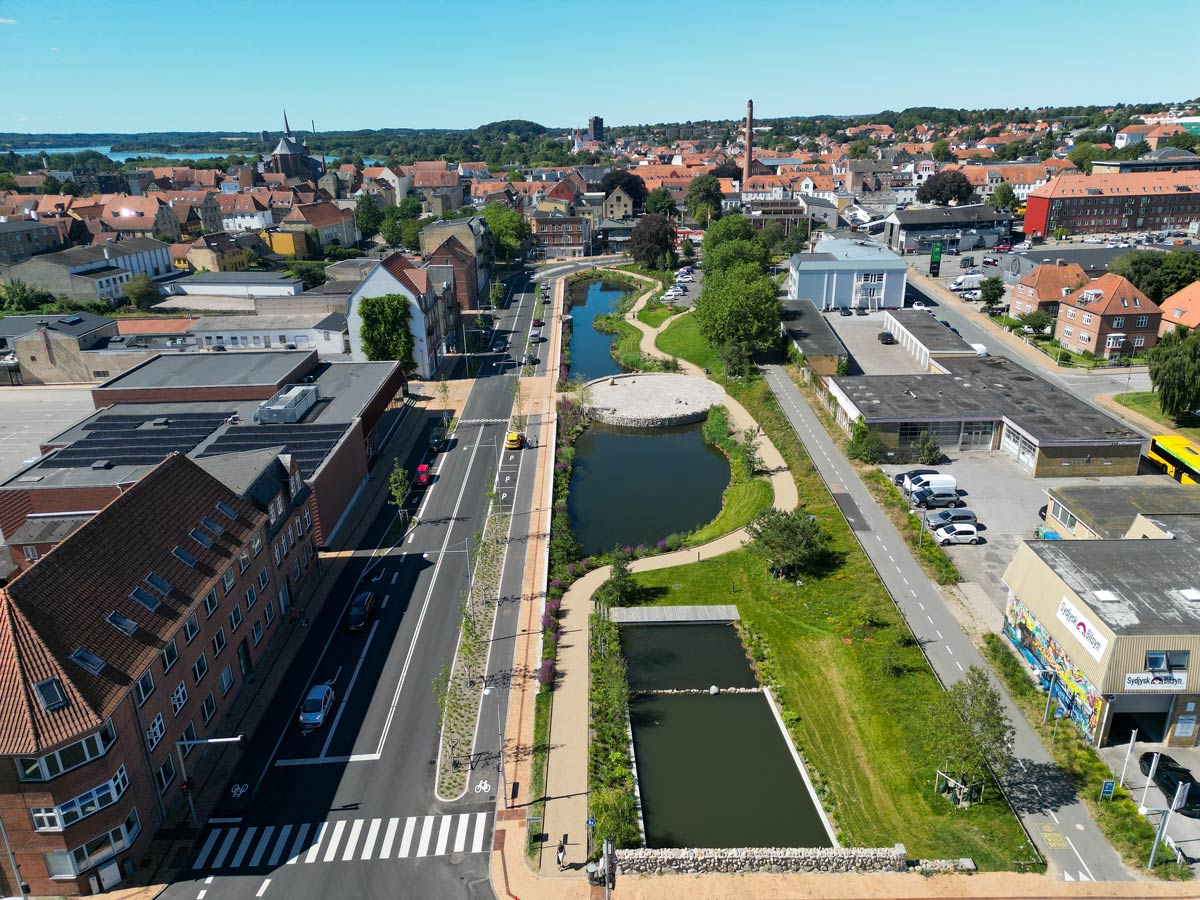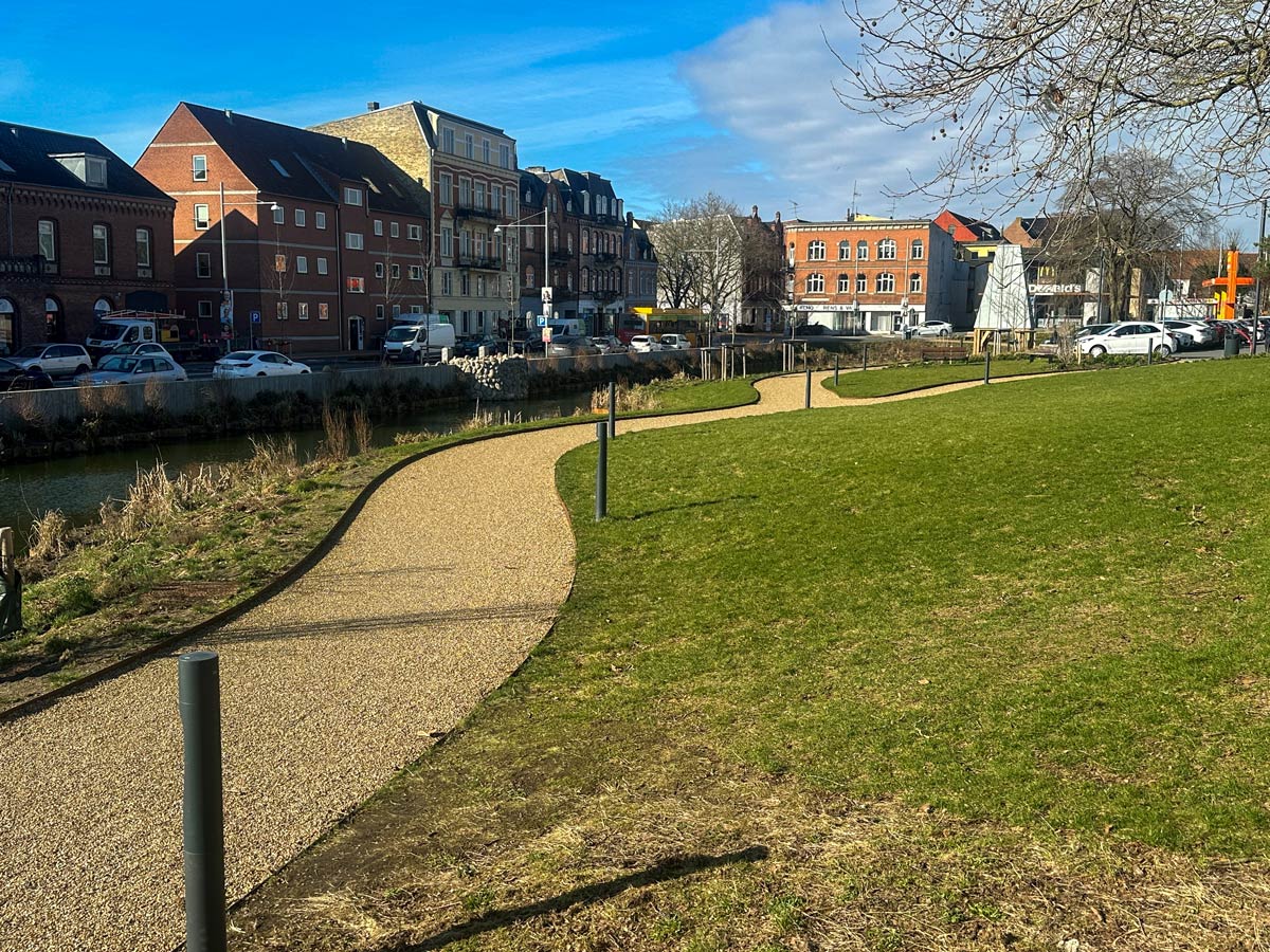 ”Vi har transformeret et gråt og lidt kedeligt område af byen til et levende parkrum, alle kan have glæde af. Parken binder samtidig den historiske bymidte sammen med den nye bydel på havnen, og bassiner sikrer effektiv håndtering af regnvand,” fortæller projektleder i Haderslev Kommune Jens-Kristian Mikkelsen.
