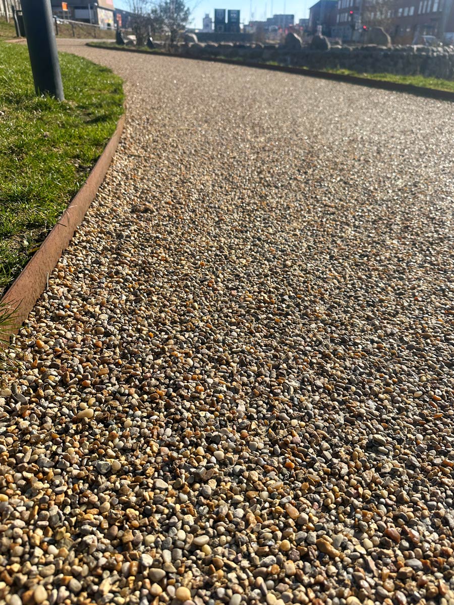 Til projektet er der anvendt majssten og det plantebaserede bindemiddel Vegecol, som er udlagt på et nyt asfaltunderlag. Fordi bindemidlet er transparent, træder stenenes farver mere frem, og overfladen smelter naturligt ind i de grønne og blå omgivelser.